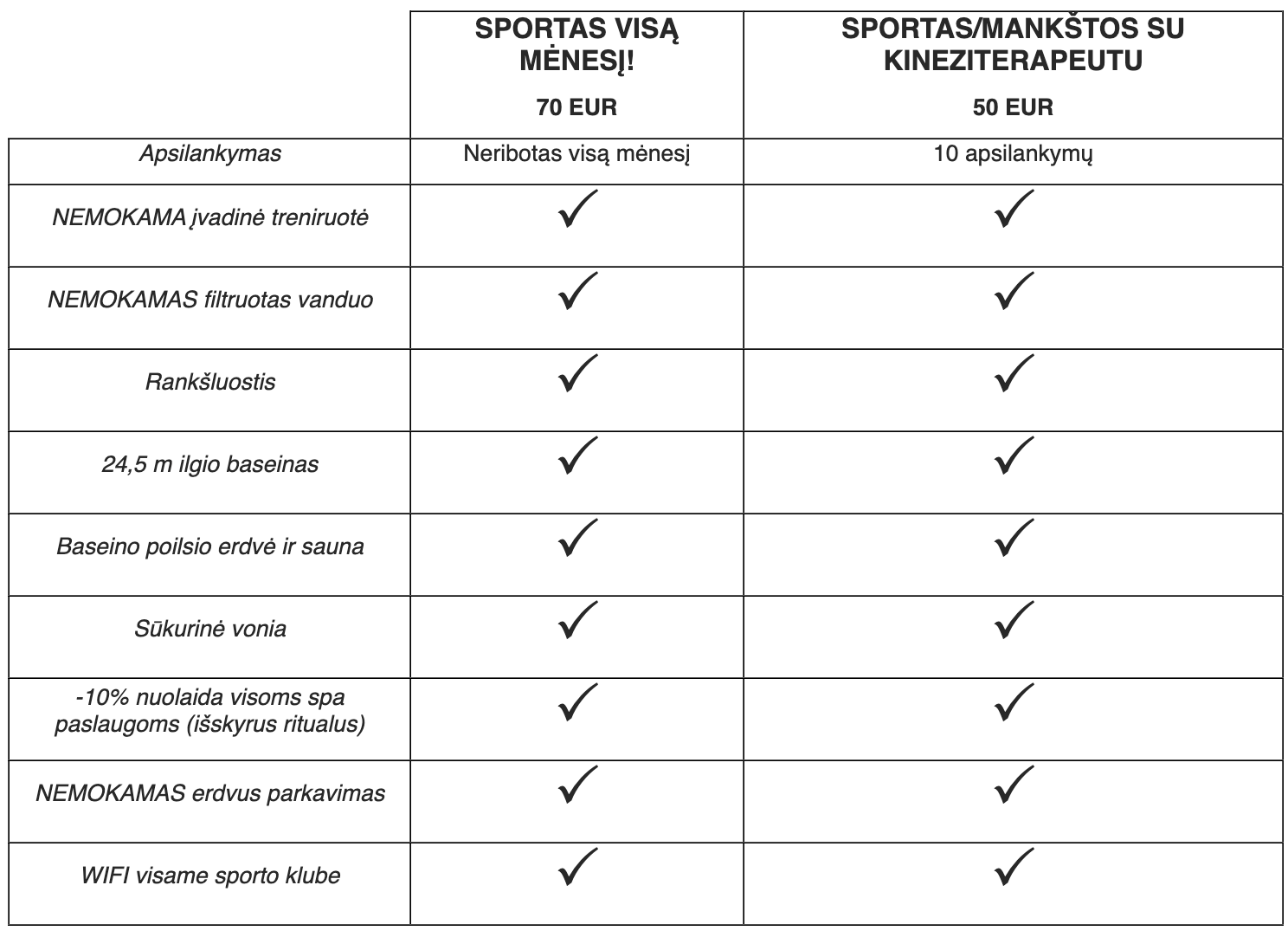 ・Sportas visą mėnesį – 70 € (neribotas apsilankymų skaičius mėnesiui)